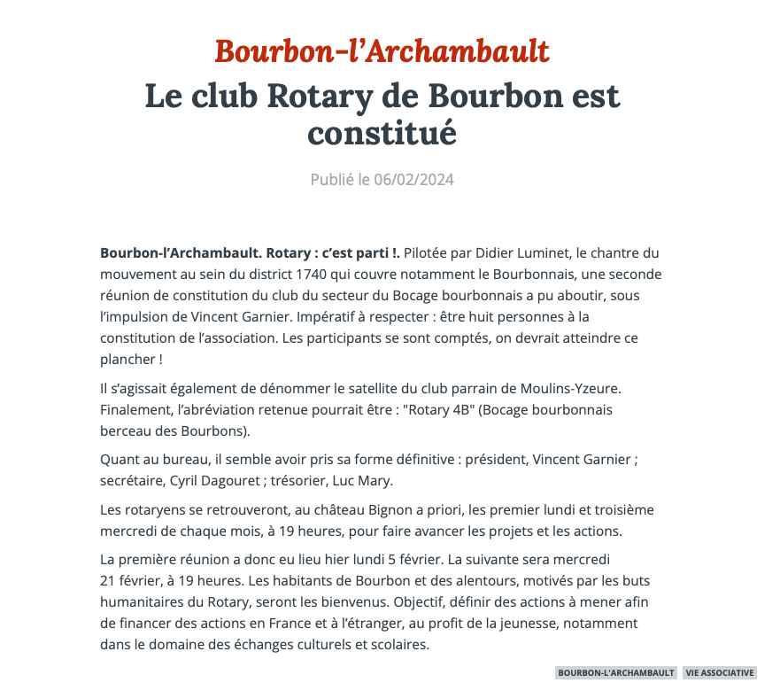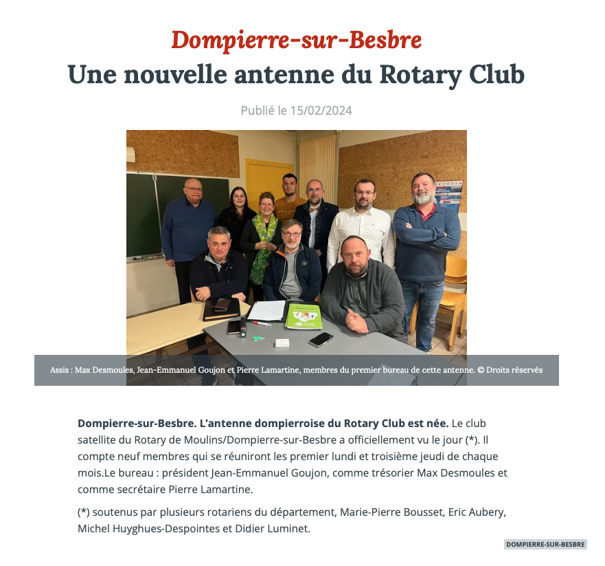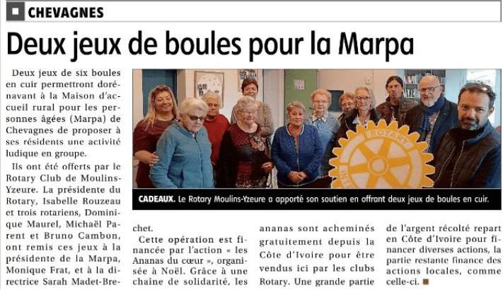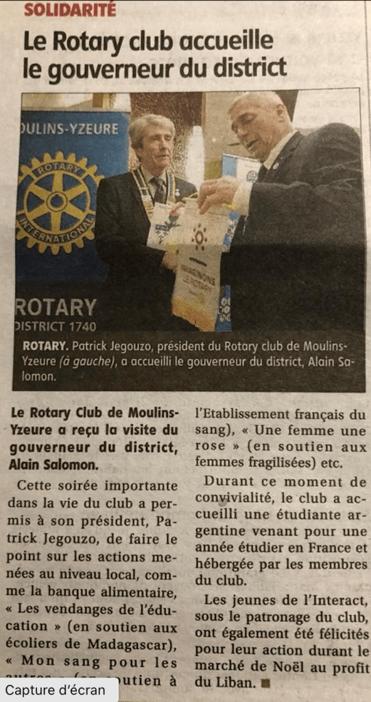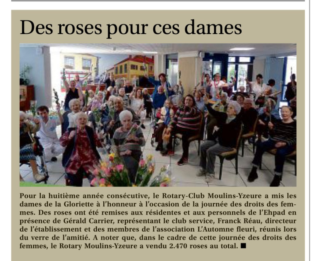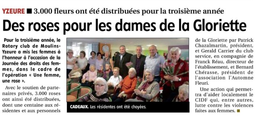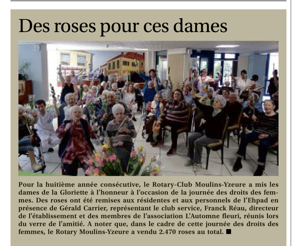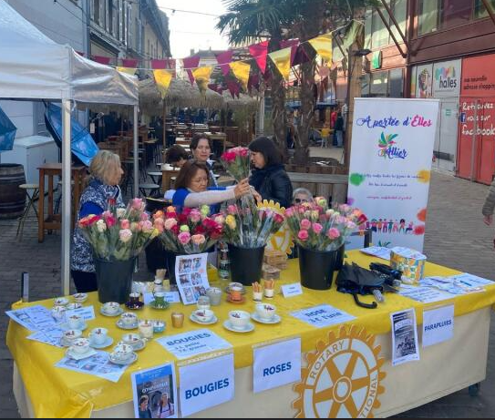 Le soutien du Rotary Club Moulins-Yzeure s’est traduit par la vente sur le marché du dimanche matin, de roses, de parapluies, et de bougies confectionnées par les conjoints un après-midi d’hiver. L’action a permis de mieux faire connaître cette jeune association et a dégagé un bénéfice que notre Club remettra à la présidente de A Portées d’Elles lors d’un prochain dîner.
