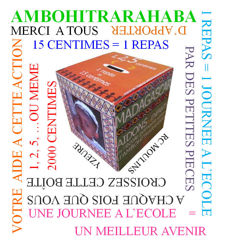 La plus emblématique est celle des boites (voir ci-après). Grâce à ces boites, des pièces de 1 centimes à 2 euros sont collectées. Il faut savoir que 15 centimes récoltés permettent de financer le repas d’un enfant !!! Vous pouvez nous contacter pour obtenir gracieusement une boite de collecte.