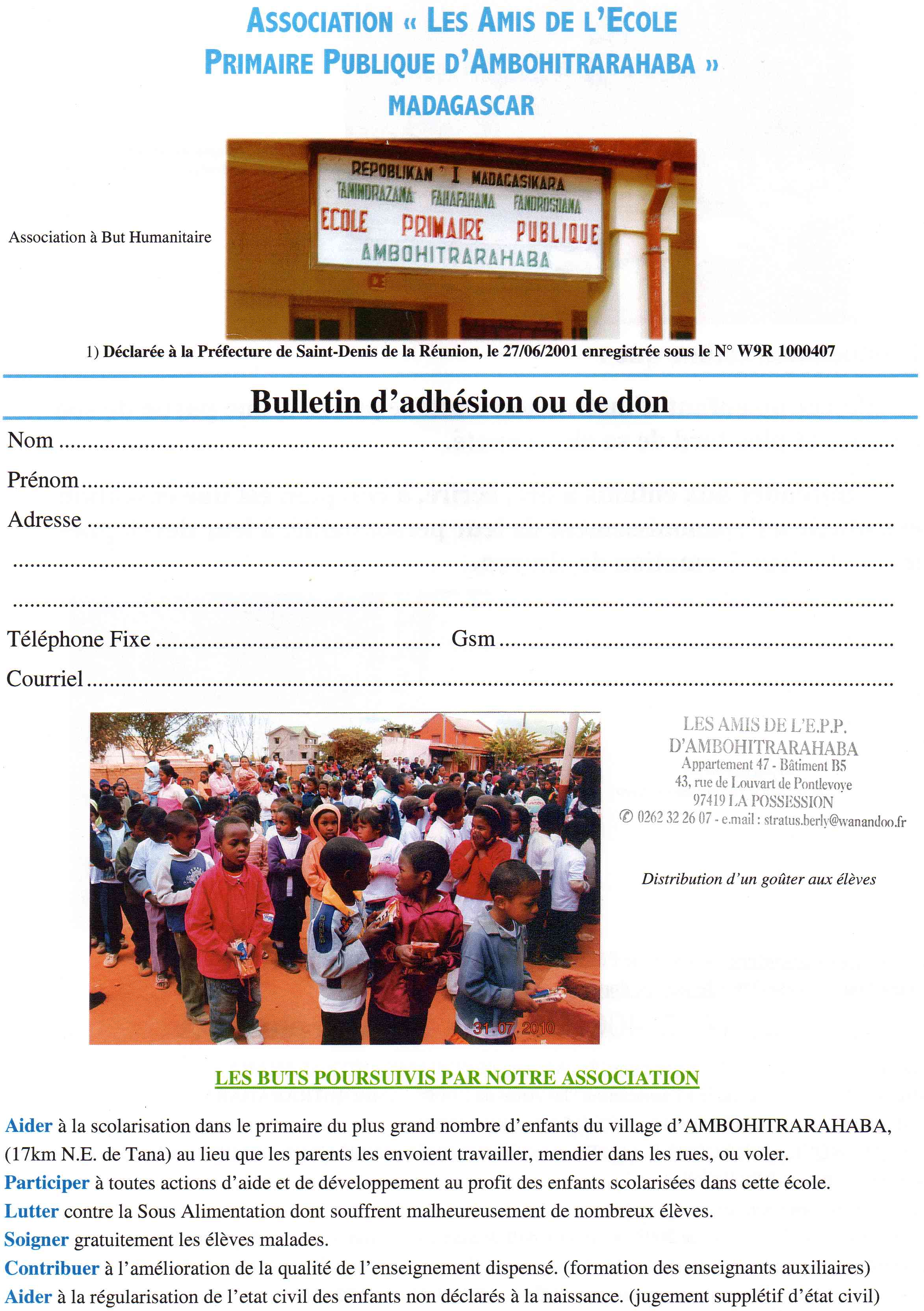 L’association « Les amis de l’Ecole Primaire Publique d’Ambohitrarahaba » chère à notre doyen Eugène PERRIN a pour but de venir en aide aux enfants de Madagascar qui fréquentent cette institution. C’est en lien avec Jacques BERLY, présent sur place, que Bruno CAMBON coordonne de Moulins différentes actions.