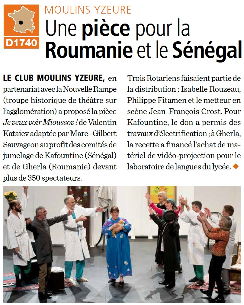 Deux jours plus tard, le samedi 29 octobre, les rotariens du club seront mobilisés, avec en tête d’affiche Laurence Viallet et Raphaël Mérot, pour l’organisation d’une soirée cabaret au profit de l’association l’Envol. Rendez-vous à Avermes, salle Isléa, pour une soirée de fête avec de l’humour, du chant, de la magie et de la danse. A noter, entre autre, la présence exceptionnelle de Henri Giraud qui fera revivre Coluche le temps de quelques sketchs.