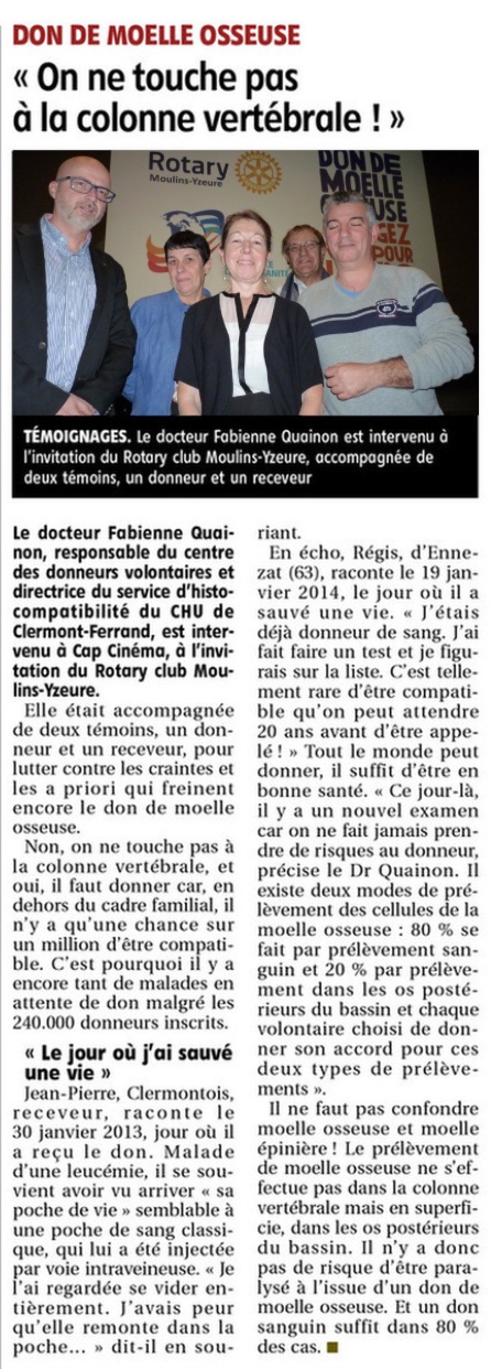 Le Rotary-Club de Moulins-Yzeure organise avec le soutien de l’Etablissement Français du Sang, une animation le samedi 13 mai après-midi pour la promotion des dons de moëlle osseuse, de sang et organes. Des professionnels, des associations, des donneurs et des greffés seront présents pour sensibiliser, informer et promouvoir toutes ces formes de dons.