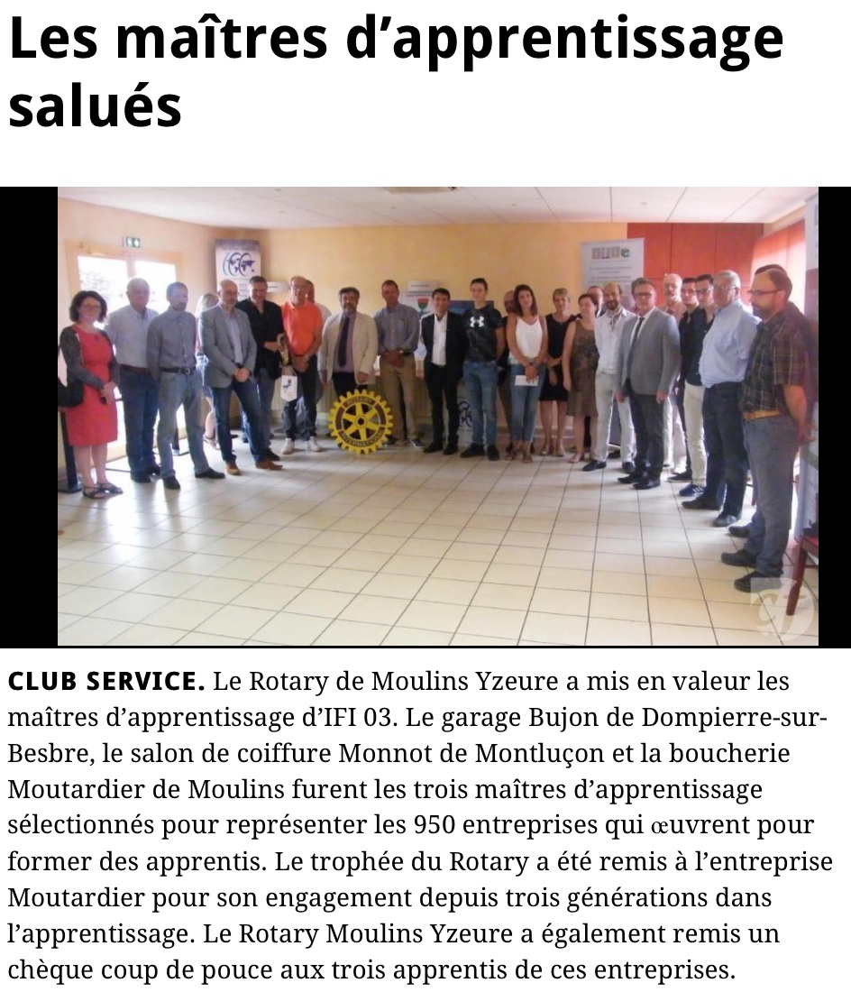 Dans le cadre du programme « Action professionnelle », le Rotary Club de Moulins-Yzeure, a souhaité mettre en avant l’apprentissage en soulignant la qualité du travail réalisé et l’implication des maîtres d’apprentissage. Merci à Didier Luminet, d’avoir mené cette action qui a permis au président Dominique MAUREL, de remettre le Prix Métier Xavier Golliaud à Yves MOUTARDIER.