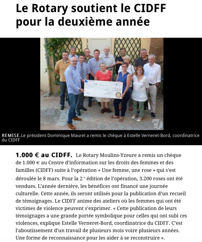 Le journal La Montagne, dans son édition du 26 novembre, présente l’atelier expression-écriture du CIDFF, qui a permis à un groupe de femmes d’exprimer au travers de l’écrit, les violences subies. Tous ces récits qui les aident dans leurs parcours de reconstruction, ont été regroupés dans un recueil. Le Rotary Club de Moulins-Yzeure qui a apporté une contribution financière pour l’édition de ce recueil, les remercie et les félicite pour ce magnifique travail.