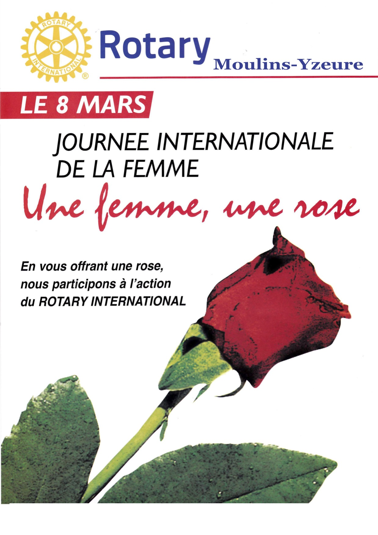 Le Rotary Moulins-Yzeure organise l’opération « une femme-une rose » qui se déroule traditionnellement lors de la journée internationale des femmes le 8 mars.